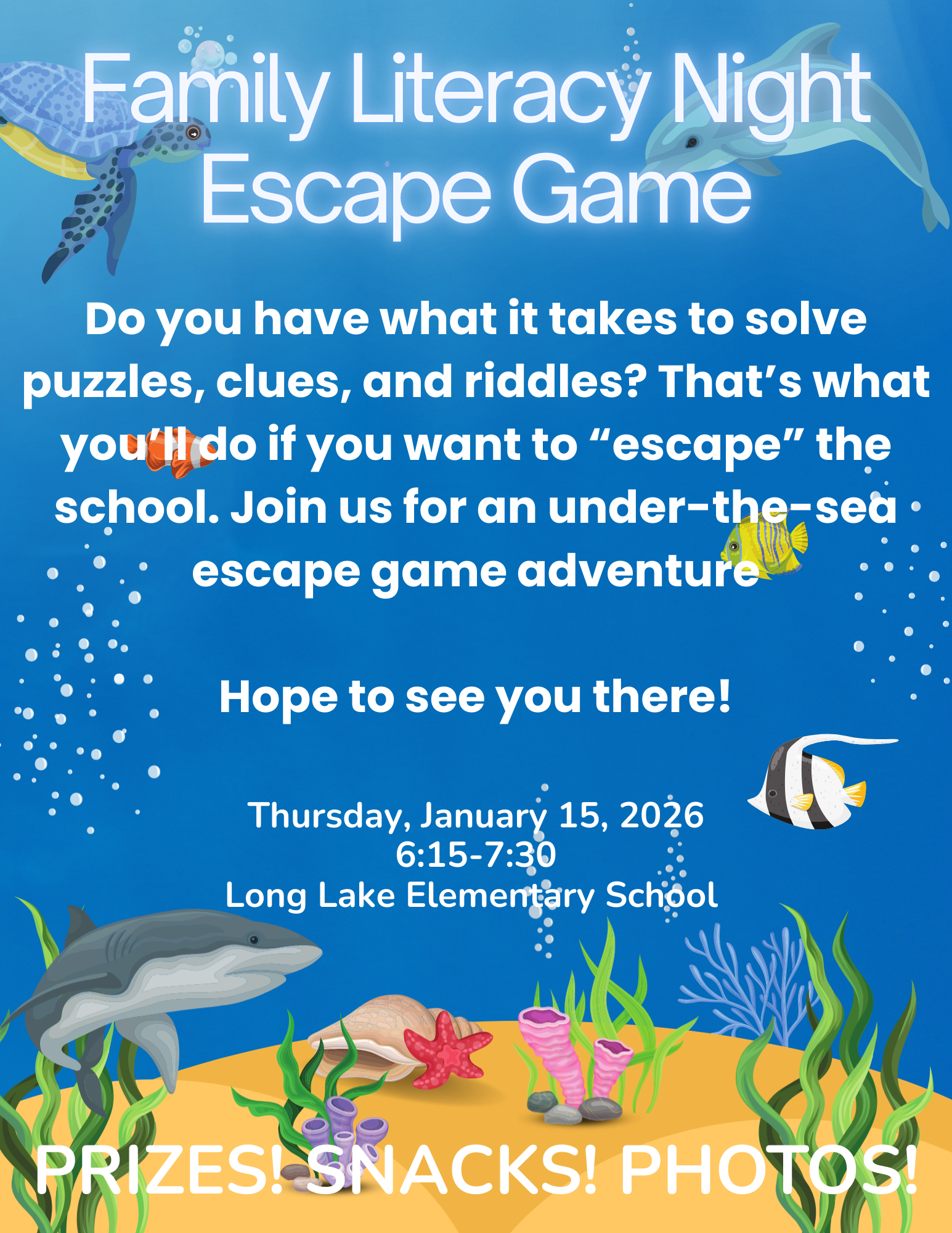 We also hope you plan to join us next Thursday, January 15th at 6:15 p.m. for our Free Family Fun Night Escape Room! Once again we have created puzzles and games for families to solve to "Escape" the Ocean and earn a prize! It's a free family event hosted by Long Lake. We also have our PTO meeting happening at 6:30 that evening. Escape Room Invitation